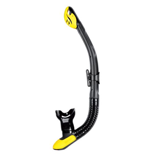 Attach the snorkel to the left side of your mask strap using the included adjustable clip. Adjust the height so that the mouthpiece fits comfortably into your mouth without stretching the corrugated hose. Upon immersion, the top valve will close automatically. Always take your first breath carefully when surfacing, even though the Dry Top system is highly effective.